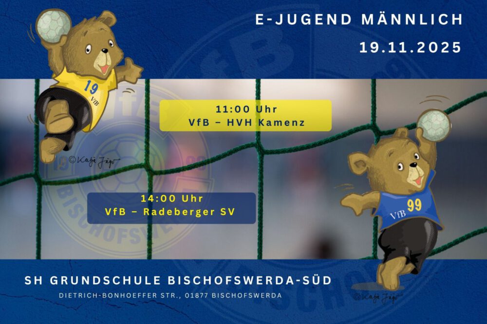 Auch am Feiertag, den 19.11.25, sind die Mädchen und Jungen der männlichen Jugend E erneut im Einsatz. Die Spiele wurden wegen der Mini-WM verlegt und finden nun in der Halle Bischofswerda-Süd statt.