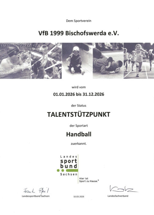 Auch im dritten Jahr in Folge kann sich der VfB 1999 Bischofswerda über die Auszeichnung als offizieller Talentstützpunkt in der Sportart Handball freuen. Dies zeigt den kontinuierlichen und engagierten Einsatz für eine erfolgreiche Nachwuchsförderung. Der Verein schaffte es auch im Jahr 2025 wieder, vielen Jugendmannschaften – beginnend bei der Ballschule bis hin zur B-Jugend – einen stabilen Trainings- und Spielbetrieb zu ermöglichen. Das ist keineswegs selbstverständlich und setzt ein hohes Maß an Engagement aller Beteiligten voraus.